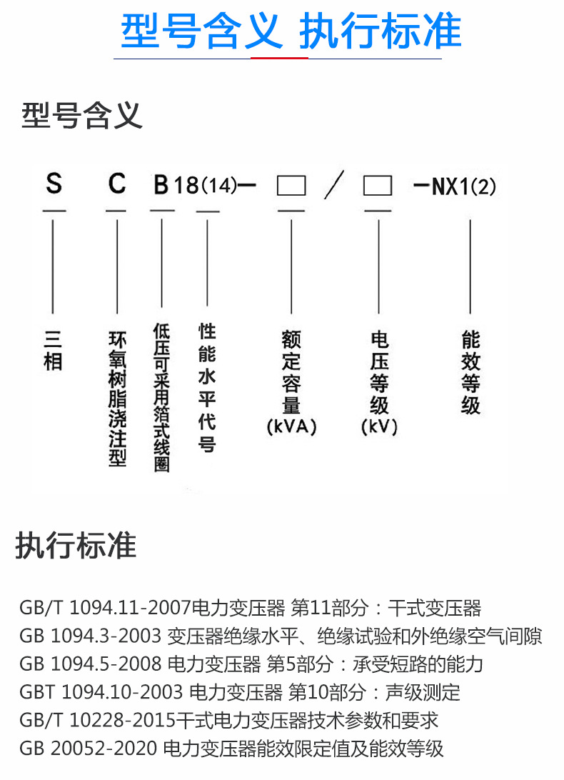 SCB表示三相樹脂澆注干式變壓器,14表示變壓器性能序列水平,1250指變壓器的額定容量,10kV是變壓器的額定電壓,NX2標(biāo)注為二級能效變壓器,是滿足二級能效的1250KVA干式變壓器。