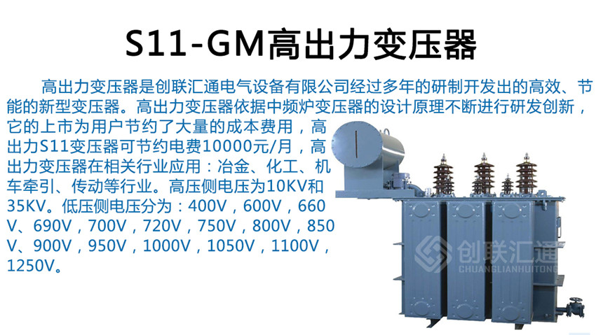 S11-GM高出力變壓器適用于冶煉廠、特別是鑄造廠、大型用電企業等,為用戶節省大量的固定電費,經濟效益顯著。